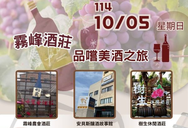 2025 年 9 月 8 日【2025/10/05】霧峰品嚐美酒之旅活動名稱:霧峰品嚐美酒之旅 好消息好消息,常務監事林立勲任職的農創興旅行社,舉辦了一日品嚐美酒行程 有吃有喝,最好自帶牛肉乾! 限定有效會員參加,名額30位額滿為止,歡迎大家踴躍報名!預計行程: 08:00 協會出發 08:15 福華飯店出發 1.霧峰酒莊餐仿製酒過程導覽,品嚐美酒 2.安貝斯釀酒故事館(午餐特色海鮮粥)餐後地酒導覽解說,深度品酒 3.樹生酒莊,樹生酒莊品酒體驗,導覽精品介紹 4. […]